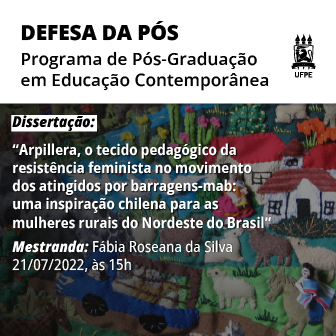 O trabalho tem o título “Arpillera, o tecido pedagógico da resistência feminista no movimento dos atingidos por barragens-mab: uma inspiração chilena para as mulheres rurais do Nordeste do Brasil”. A defesa conta com a banca examinadora formada pelos docentes Allene Carvalho Lage (UFPE-CAA-PPGEduc), Everaldo Fernandes da Silva (UFPE-CAA-PPGEduc), Jaqueline Barbosa da Silva (UFPE-NFD), Marcelo Henrique Gonçalves de Miranda (UFPE-CAA-PPGEduc) e Maria do Carmo Gonçalo Santos (UFPE-NFD).