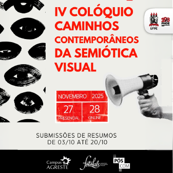 Estão abertas as inscrições para o IV Colóquio Caminhos Contemporâneos da Semiótica Visual, que ocorre nos dias 27 e 28 de novembro, no Centro Acadêmico do Agreste (CAA) da UFPE, em Caruaru. O encontro terá uma programação dividida em dois momentos – presencial (27) e virtual (28) –, ambos destinados à apresentação oral das propostas submetidas e à participação de ouvintes. Os interessados podem se inscrever até 20 de outubro, mediante o preenchimento do formulário on-line.