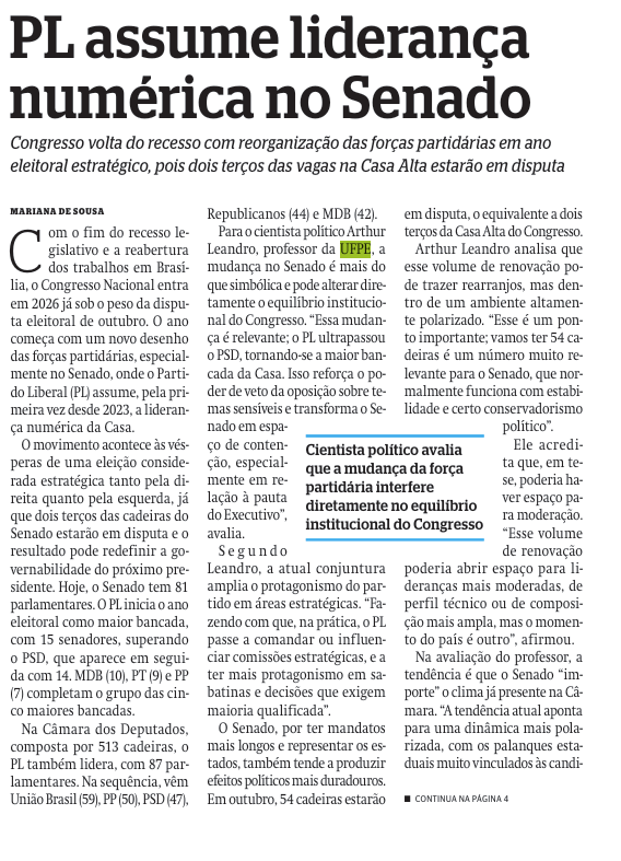 - Diário de Pernambuco- PL assume liderança numérica no Senado