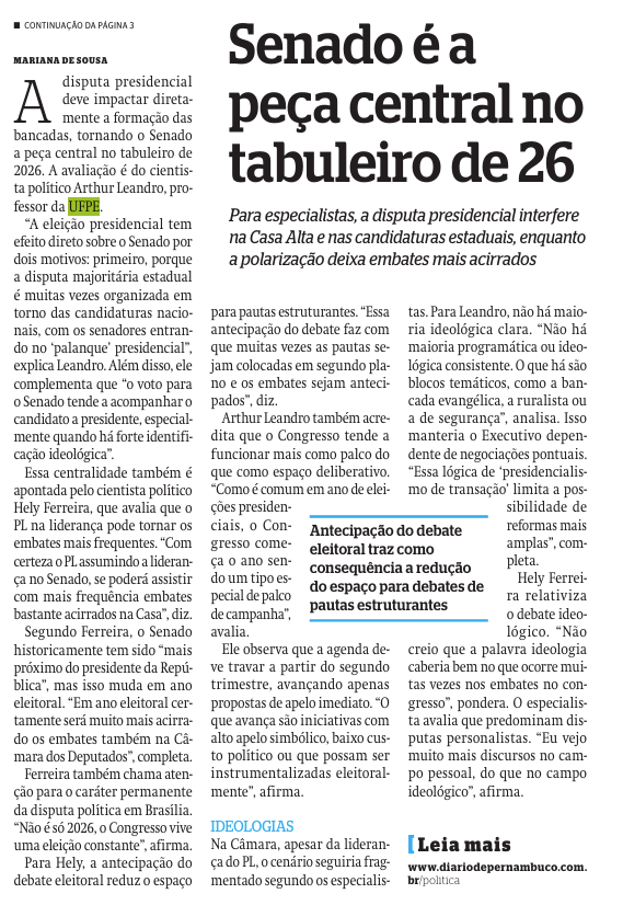 A disputa presidencial deve impactar direta mente a formação das bancadas, tornando o Senado a peça central no tabuleiro de 2026. A avaliação é do cientista político Arthur Leandro, professor da UFPE. “A eleição presidencial tem efeito direto sobre o Senado por dois motivos: primeiro, porque a disputa majoritária estadual é muitas vezes organizada em torno das candidaturas nacionais, com os senadores entrando no ‘palanque’ presidencial”, explica Leandro. Além disso, ele complementa que “o voto para o Senado tende a acompanhar o candidato a presidente, especial mente quando há forte identificação ideológica”.