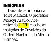Durante cerimônia na Torre Malakof. O professor Moacyr Araújo, vice reitor da UFPE, recebe as insígnias de Cavaleiro da Ordem Nacional do Mérito Francês.