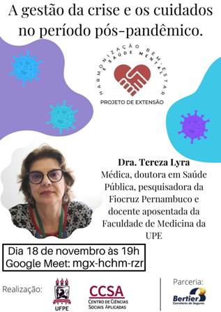 Amanhã (18), acontece a live do Programa de Harmonização, Saúde e Bem-Estar, do Centro de Ciências Sociais Aplicadas (CCSA) da UFPE, com a médica Tereza Lyra, pesquisadora da Fiocruz e docente aposentada da UPE, abordando o tema “A gestão da crise e os cuidados no período pós-pandêmico”. As inscrições para participação na live podem ser feitas aqui.