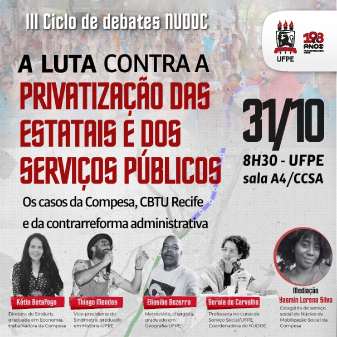 O Núcleo de Documentação sobre os Movimentos Sociais Dênis Bernardes (Nudoc) da Universidade Federal de Pernambuco (UFPE) realiza, nesta sexta-feira (31), a partir das 8h30, mais uma edição de seu Ciclo de Debates. Aberto ao público, o encontro vai debater o tema “A luta contra a privatização das estatais e dos serviços públicos: os casos da Compesa, CBTU Recife e da contrarreforma administrativa”. O evento ocorre na sala A4 do Centro de Ciências Sociais Aplicadas (CCSA), no Campus Recife, e faz parte das atividades em comemoração aos 20 anos do Núcleo. Para participar, é necessário se inscrever por meio do link.