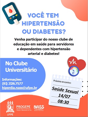 O Clube de Educação em Saúde é um projeto de extensão para os servidores e dependentes que possuem hipertensão arterial, diabetes e/ou pré-diabetes, realizado pela equipe multidisciplinar do Núcleo de Atenção à Saúde do Servidor (Nass) da Diretoria de Qualidade de Vida (DQV) da Pró-Reitoria de Gestão de Pessoas e Qualidade de Vida (Progepe).