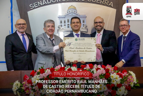 A Assembleia Legislativa do Estado de Pernambuco (Alepe) realizou, na noite da última quarta-feira (22), no Auditório Senador Sérgio Guerra, reunião solene para a entrega do título honorífico de Cidadão Pernambucano ao médico, pesquisador e Professor Emérito da UFPE Raul Manhães de Castro. O evento contou com a presença do reitor da UFPE, Alfredo Macedo Gomes; e do diretor do Centro de Ciências Médicas (CCM) da Universidade, Luiz Alberto Mattos; além de parlamentares, familiares e amigos. O evento está disponível na internet.