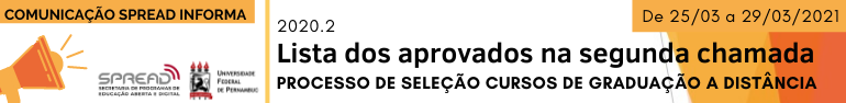 A Universidade Federal de Pernambuco - UFPE, através da Pró-reitoria de Graduação (Prograd) e a Secretaria de Programas de Educação Aberta e Digital - SPREAD, divulga nesta quarta-feira (24), a lista dos candidatos aprovados na segunda chamada do Processo Seletivo - 2020.2 para ingresso nos cursos de graduação a distância da UFPE, no âmbito do Sistema Universidade Aberta do Brasil - UAB. A relação está disponível no site da Covest.