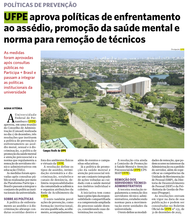 - Jornal do Commercio- UFPE aprova políticas de enfrentamento ao assédio, promoção da saúde mental e norma para remoção de técnicos