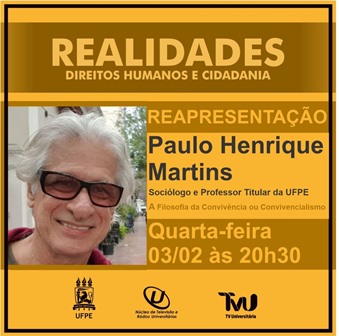 Nesta quarta-feira (3), às 20h30, na TVU (canal 11.1) haverá reapresentação no Programa Realidades – Direitos Humanos e Cidadania, que vai falar sobre “A Filosofia da Convivência ou Convivencialismo”, com o professor e sociólogo Paulo Henrique Martins, da UFPE. O Realidades é apresentado pelo professor Marcelo Pelizzoli e tem direção de Helder Vieira.