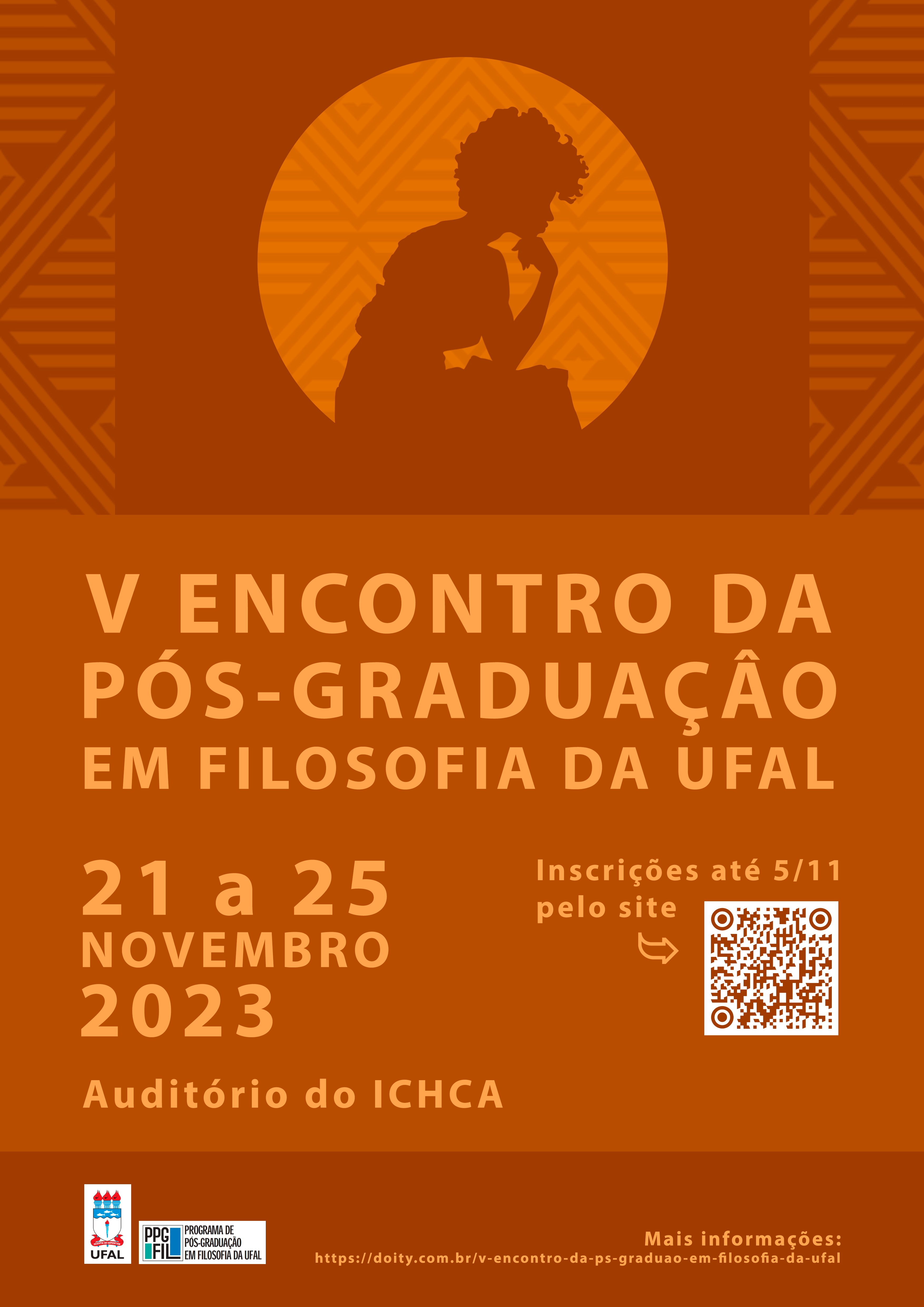 O Programa de Pós-Graduação em Filosofia da Universidade Federal de Alagoas tem a honra de anunciar o V Encontro da Pós-graduação em Filosofia da UFAL, que acontecerá nos dias 21 a 24 de novembro de 2023, nesta instituição. Por razão de que no dia que antecede o início do evento, a saber, dia 20 de novembro, comemora-se o Dia Nacional de Zumbi e da Consciência Negra, a programação contará com palestras envolvendo a temática do racismo e da violência em sua conexão com a reflexão filosófica.