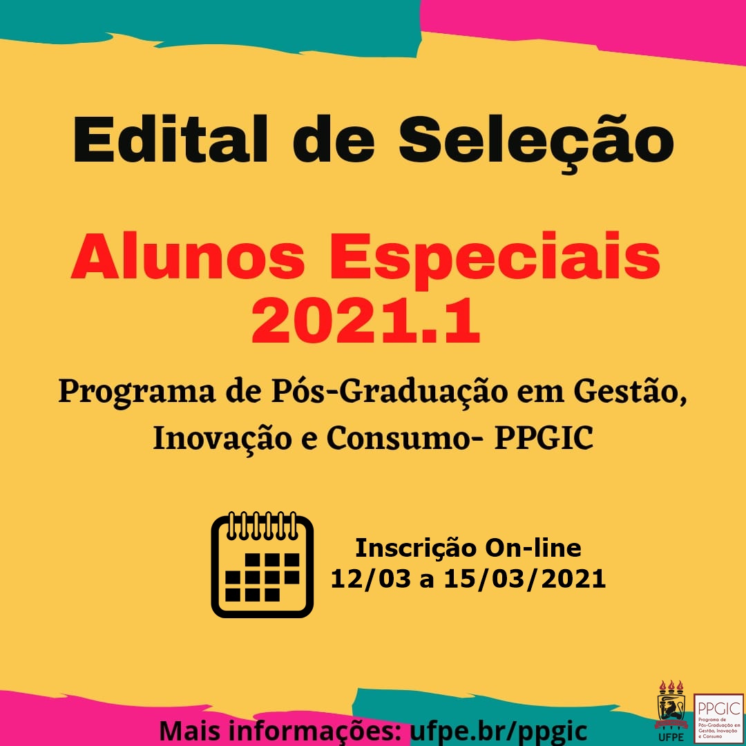 O Edital de Seleção Para Alunos Especiais 2021.1 do Programa de Pós-Graduação em Gestão, Inovação e Consumo-PPGIC está disponível no nosso site: https://www.ufpe.br/ppgic