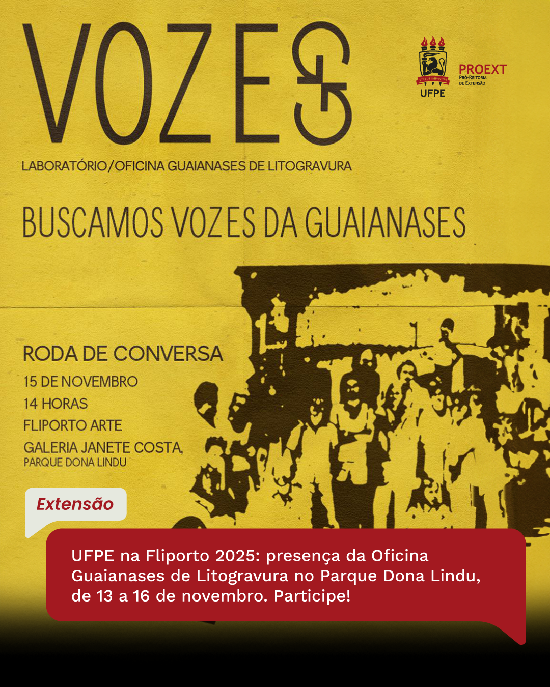 A Universidade Federal de Pernambuco participa desta edição por meio do Laboratório/Oficina Guaianases de Litogravura, que estará presente na Galeria Janete Costa com exposição, roda de conversa e estande. A exposição coletiva intitulada “Vozes: Laboratório/Oficina Guaianases de Litogravura” ficará em cartaz de 13 a 16 de novembro, com visitação diária das 13h às 21h. A mostra recupera a trajetória de 21 anos do grupo e evidencia sua importância para a produção em gravura em Pernambuco, apresentando obras que representam etapas distintas do seu histórico.