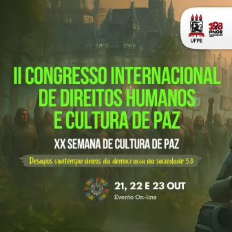 A Universidade Federal de Pernambuco (UFPE), por meio da Comissão de Direitos Humanos (CDH) e do Espaço de Diálogo e Reparação (EDR), convida estudantes e pesquisadores, nacionais e internacionais, a participarem do II Congresso Internacional de Direitos Humanos e Cultura de Paz, que ocorre de 21 a 23 de outubro, em formato on-line, com transmissão ao vivo pelo canal oficial da UFPE no YouTube. As inscrições são gratuitas e podem ser feitas pelo site oficial do evento.