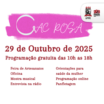 O projeto de extensão Probem do CAC realiza, no próximo dia 29, uma série de atividades no Campus Recife da UFPE relacionadas ao Outubro Rosa, com informações sobre a prevenção do câncer de mama e incentivo ao cuidado integral com a saúde da mulher. O acesso é gratuito e haverá ações no Centro de Artes e Comunicação (CAC) e no Complexo de Convenções, Eventos e Entretenimento (CCEE), além de uma entrevista transmitida pela Rádio Paulo Freire e uma roda de conversa com transmissão pelo YouTube.