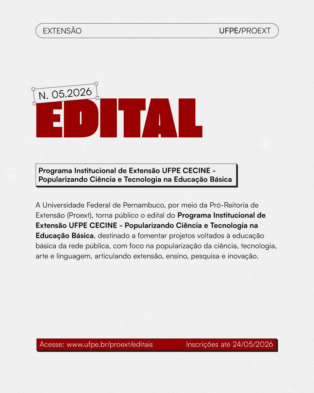 A Universidade Federal de Pernambuco, por meio da Pró-Reitoria de Extensão (Proext), torna público o edital do Programa Institucional de Extensão UFPE CECINE - Popularizando Ciência e Tecnologia na Educação Básica, destinado a fomentar projetos voltados à educação básica da rede pública, com foco na popularização da ciência, tecnologia, arte e linguagem, articulando extensão, ensino, pesquisa e inovação.