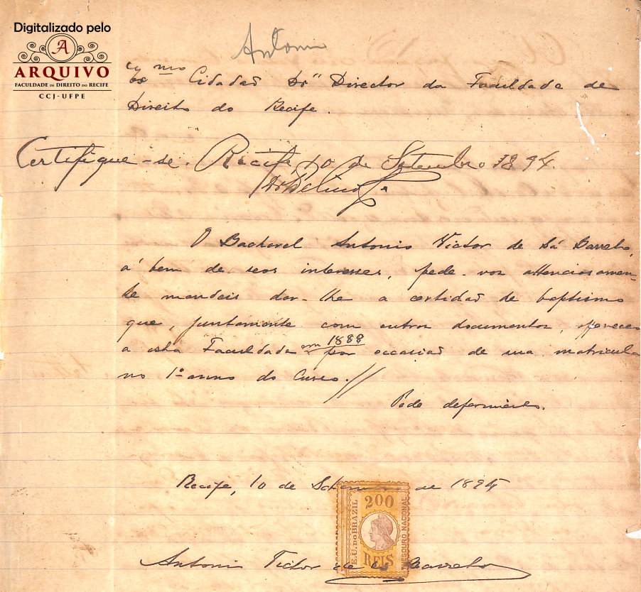 Aos 27 de outubro de 1894, presente o Doutor Adelino Antônio Luna Freire filho, foi por este conferido o grau de bacharel em Ciências Jurídicas e Sociais ao Senhor Antônio Victor de Sá Barretto na Faculdade de Direito do Recife.