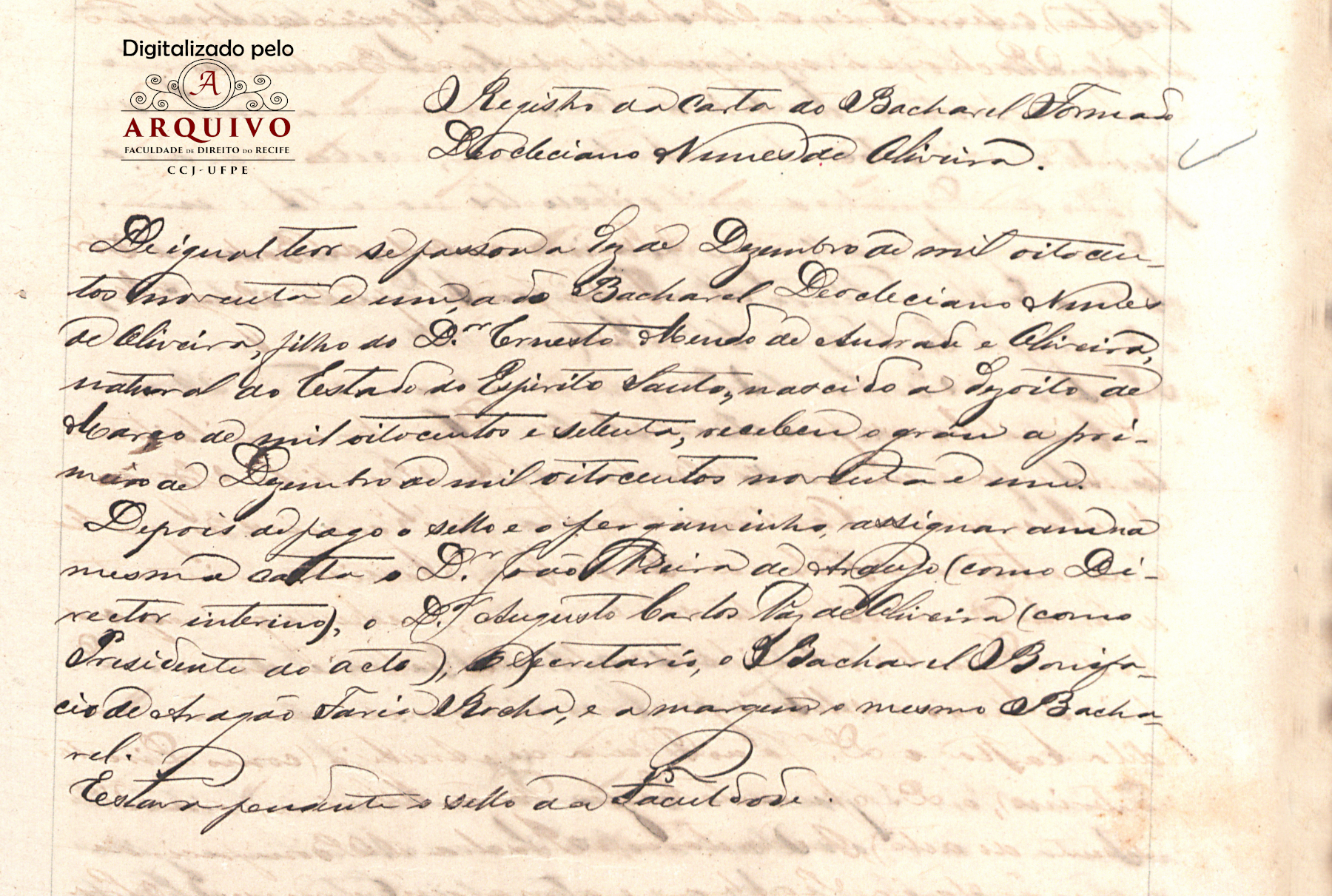 Em 27 de março de 1908, o presidente do estado do Espirito Santo, Henrique da Silva Coutinho, resolver nomear o Dr. Deocleciano Nunes de Oliveira, lente da História Unviversal e Geografia da Escola normal, para a cadeira de História Universal do Ginásio do Espirito Santo, sem prejuízo da vitaliciedade a que por lei lhe compete.