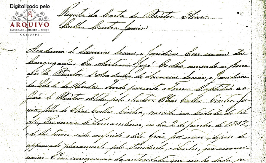 Aos 03 de julho de 1841 neste Mosteiro de São Bento e Secretaria de Academia Jurídica de Olinda, presente o Diretor interino Miguel do Sacramento Lopes Gama, compareceu o Dr. Elias Coelho Cintra por seu bastante procurador Dr. Filippe Jansen de Castro Albuquerque e apresentando a carta Imperial pela qual foi nomeado Lente Substituto do Curso de Ciência Sociais e Jurídica da Cidade de Olinda.