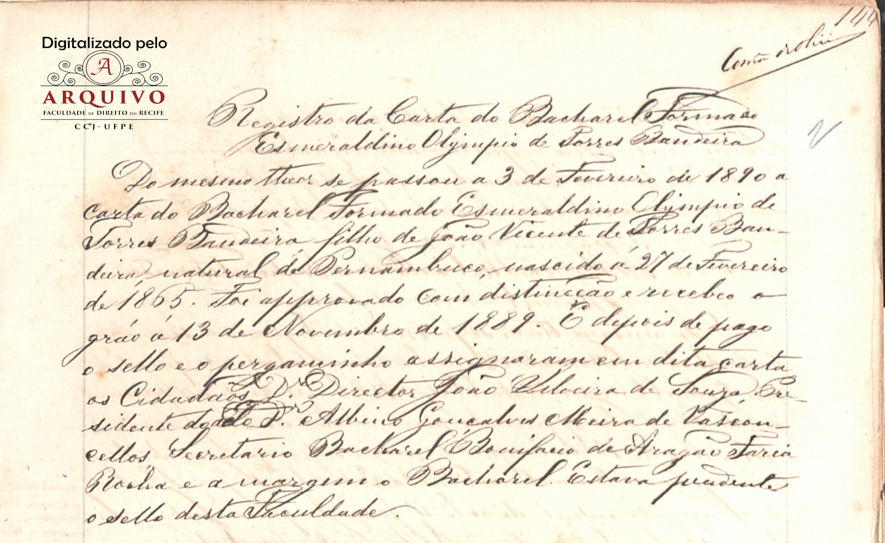 Conforme consta na certidão de idade do aluno Esmeraldino Olympio de Torres Bandeira, nasceu em Pernambuco no dia 27 de fevereiro de 1865, filho de João Vicente de Torres Bandeira e Maria Joaquina do Rego Barros. Aos 28 de outubro de 1865, na Matriz de São José do Recife, foi batizado pelo vigário interino Frei Antônio de Santa Rita, foi madrinha por devoção Nossa Senhora da Conceição e padrinho o tio paterno Manoel Ignácio de Torres Bandeira