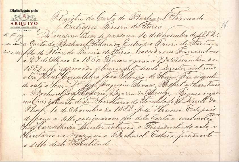 >> Livro de Registro de diplomas de bacharéis (1881 - 1894) – Acervo do Arquivo da FDR