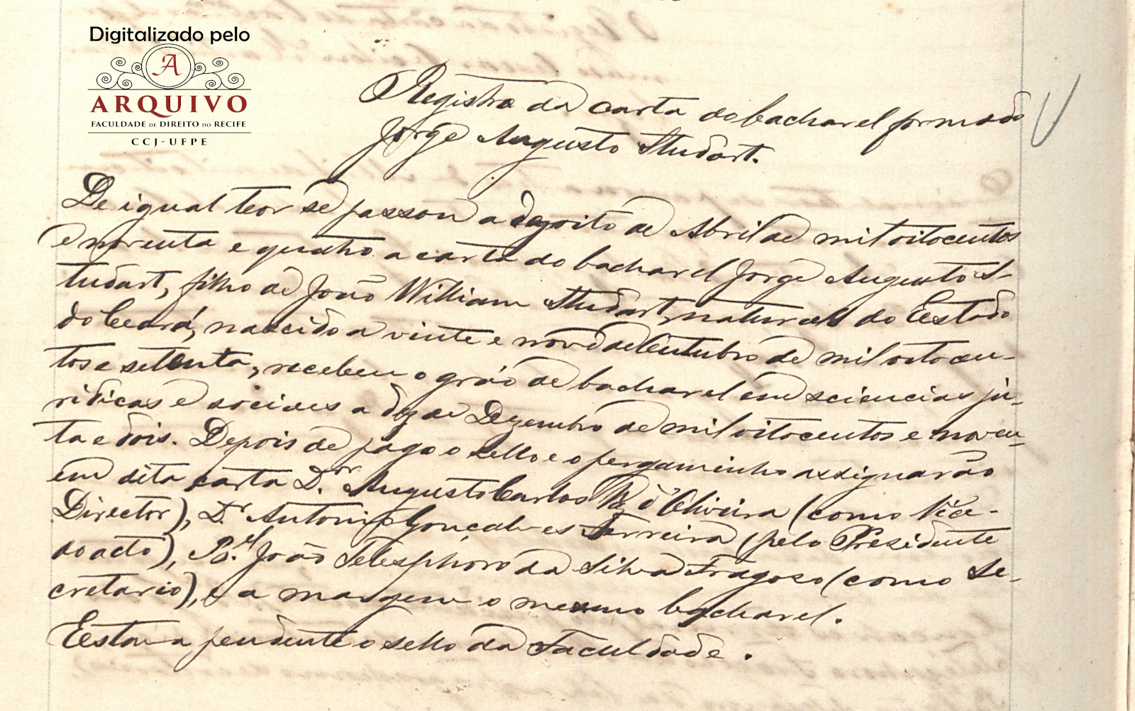 Há 150 anos nascia, o juiz de direito que ocupou altos cargos da magistratura no estado da Amazonas e um grande conhecedor da língua Tupi - Jorge Augusto Studart, nasceu em 29 de outubro de 1870 em Fortaleza – Ceará, filho de João William Studart, comerciante e primeiro vice-cônsul britânico no Ceará, e Leonisia de Castro Studart (sua segunda esposa e cunhada). Seu meio-irmão, Guilherme Studart, Guilherme Chambly Studart - o Barão de Studart, foi médico e historiador.