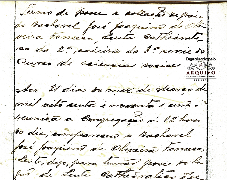 No dia 31 de Março de 1891 teve lugar a primeira sessão ordinária, a qual começou com a colação do grau de Doutor ao Dr. Oliveira Fonseca, seguindo-se a posse de Lente Catedrático da Faculdade de Direito do Recife na 2ª cadeira da 3ª séria do curso de Ciências Sociais para que fora nomeado por Decreto de 21 de Fevereiro 1891.