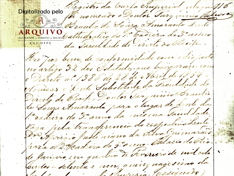 Após transcorrido onze anos, e no exato dia 14 de Fevereiro de 1871, perante o Diretor Barão de Camaragibe, compareceu Dr. Tarquínio Bráulio de Souza Amaranto para tomar posse do lugar de Lente Catedrático da 1ª cadeira do 3º ano (Direito Civil Pátrio), vaga por ter sido transferido o respectivo Catedrático Dr. Aprígio Justiniano da Silva Guimarães para 2º cadeira do 5º ano, do qual foi Proprietário o Conselheiro Pedro Autran da Matta Albuquerque que foi jubilado na conformidade do decreto legislativo Nº 1769 de 13 de julho de 1870. Transferência que teve lugar por decreto imperial de 04 do corrente ano.