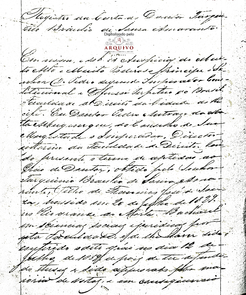 Como já mencionando anteriormente e destacando uma circunstância única na vida universitária de nosso país, apresentando um relato breve da trajetória de três irmãos consanguínea, seguindo nessa ordem cronológica de idade e de ingresso no grau máximo da vida acadêmica do Recife: tendo como genitores o Tenente Francisco José de Souza e Anna de Mello e Souza, seus filhos como o ilustrado mestre Dr. Braz Florentino Henriques de Sousa – nasceu em 04 de março de 1825, na Paraíba e faleceu 29 de março de 1870, aos 45 anos – Maranhão. Recebendo o grau de Bacharel em Ciências Jurídicas e Sociais pela FDR em 15 de outubro de 1850, na mesma Faculdade o Doutorado em 1851 e como Lente (substituto – 20 de Junho de 1855 e Catedrático da 1ª cadeira do 2º ano em 01 de Junho de 1858 na FDR), Dr. Tarquínio Bráulio de Sousa Amaranto – nasceu em 20 de julho de 1829, no Rio Grande do Norte e faleceu 29 de agosto de 1894, aos 65 anos – Rio de Janeiro. Recebendo o grau de Bacharel em Ciências Jurídicas e Sociais pela FDR em 03 de dezembro de 1857, na mesma Faculdade o Doutorado em 14 de julho de 1859 e como Lente (substituto – 31 de Março de 1860, Catedrático da 2ª cadeira do 2º ano em 14 de Fevereiro de 1871 na FDR e jubilado em 21 de Fevereiro de 1891) e Dr. José Soriano de Souza – nasceu em 15 de setembro de 1833, na Paraíba e faleceu em 12 de agosto de 1895, aos 62 anos – Recife. Graduado e doutor em Medicina, pela Faculdade do Rio de Janeiro, em 1860, também se graduou e se tornou doutor em Filosofia na Universidade de Lovaina, na Bélgica e como Lente (Com a reforma nos cursos jurídicos de Benjamin Constant, Soriano recebeu o grau de doutor por força legal, tendo sido também nomeado lente de Direito Constitucional, assumindo a 2ª cadeira da 1º série do curso de Ciência Jurídica em 12 de março de 1891).