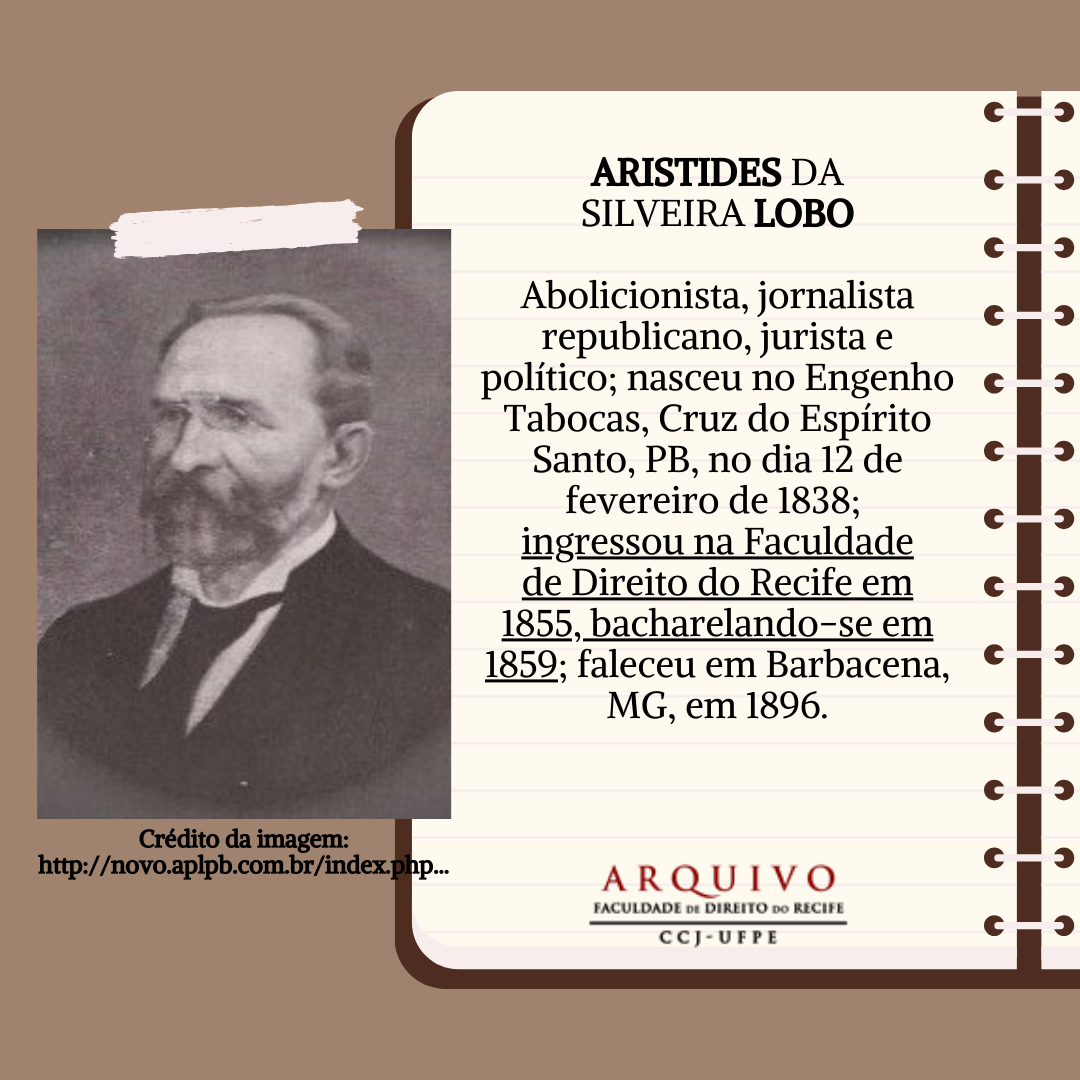 ARISTIDES DA SILVEIRA LOBO, abolicionista, jornalista republicano, jurista e político, nasceu no Engenho Tabocas, Cruz do Espirito Santo, PB, no dia 12 de fevereiro de 1838 e faleceu em Barbacena, MG, em 1896.
