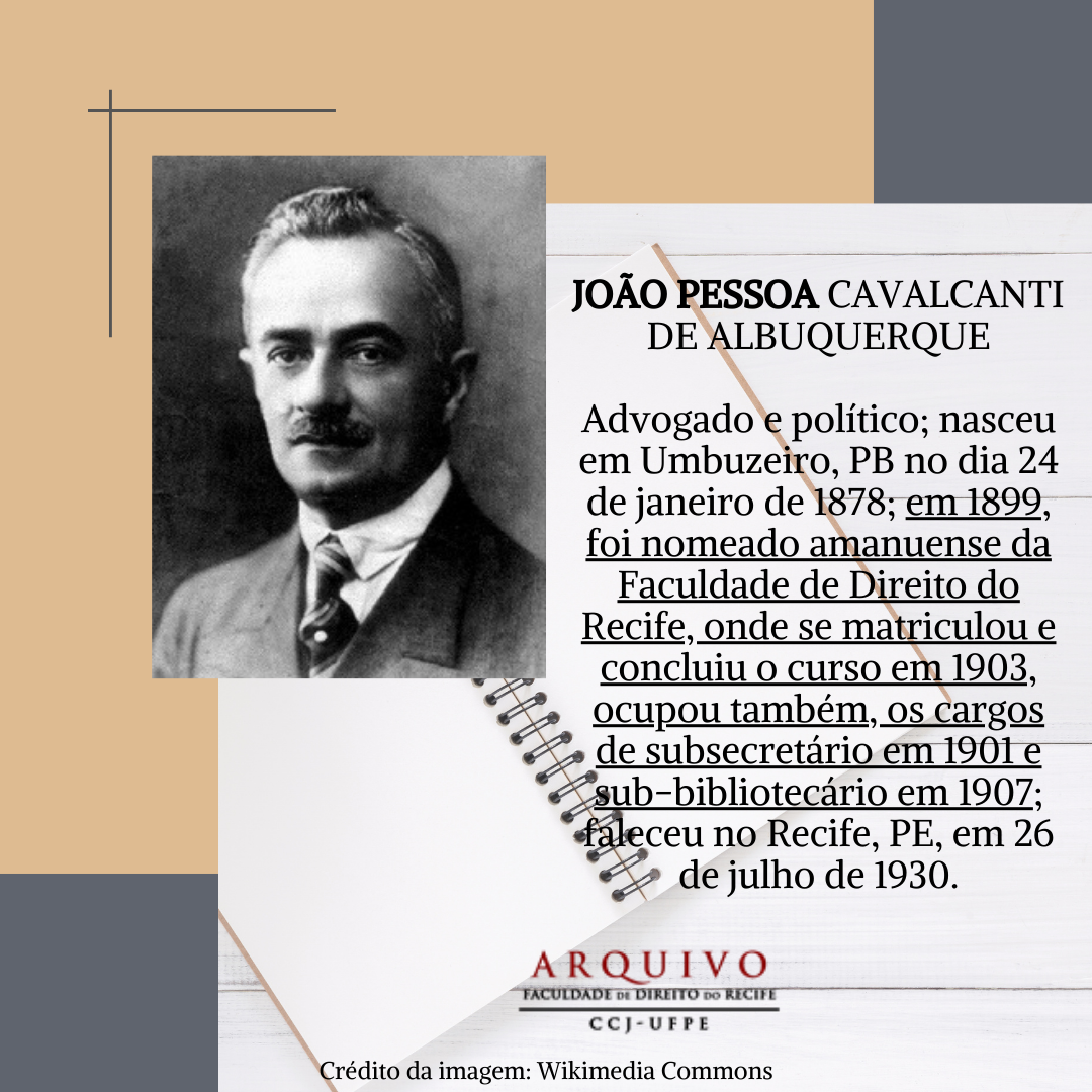 JOÃO PESSOA CAVALCANTI DE ALBUQUERQUE, advogado e político, nasceu na cidade de Umbuzeiro, Paraíba, no dia 24 de janeiro de 1878. Filho de Cândido Clementino Cavalcanti de Albuquerque e Maria de Lucena Pessoa, fez seus primeiros estudos em Umbuzeiro. Em 1889 foi levado para a cidade de Guarabira, no brejo paraibano, por sua tia paterna, Feliciana Cavalcanti de Albuquerque Paes Barreto casada com o capitão do exército Emílio Barreto. Com a transferência do tio para o Rio de Janeiro foi morar na capital federal, mudando em seguida para o estado da Bahia. Em 1894, João Pessoa volta à Paraíba, ingressa no Liceu Paraibano e incorpora voluntariamente no 27º Batalhão de Infantaria.