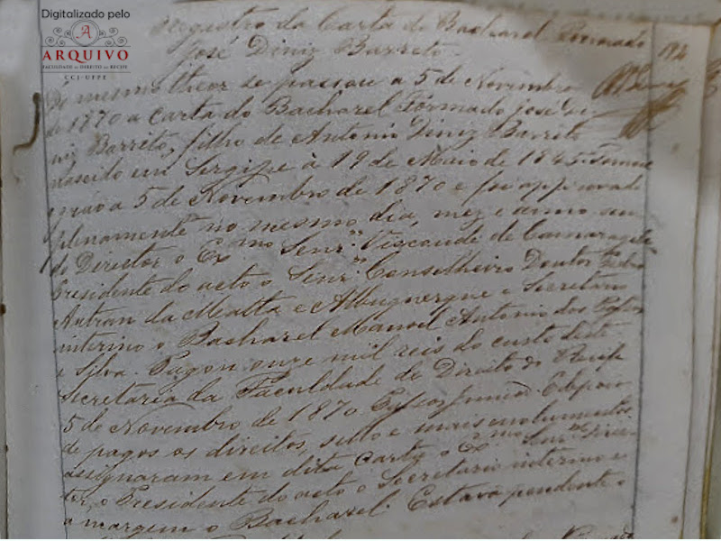 Na seguinte reunião que teve lugar no dia 25 de Março de 1891, havendo o Governo por Decreto do 21 removido para a Faculdade do Direito de S. Paulo o Dr. Manoel Clementino de Oliveira Escorel, e dado acesso para a vaga respectiva ao Dr. José Diniz Barretto, que não tinha tomado posse do lugar de substituto da 3.° secção, para que fora nomeado por Decreto de 21 de Fevereiro, tomou posse o mesmo Dr. José Diniz da lª Cadeira da 2ª Serie do Curso Jurídico, em virtude de ordem do Ministro da Instrução Pública por telegrama de 22. E conforme consta no Registro de Posse, que: Aos 25 de março de 1891, reunida a congregação as 12 horas do dia, compareceu o Bacharel José Diniz Barretto, para tomar posse do Lugar de Lente Catedrático desta Faculdade, em vista do telegrama de 22 do corrente que manda dar posse independentemente da apresentação do Título, declarou o direito empossado em seu lugar.