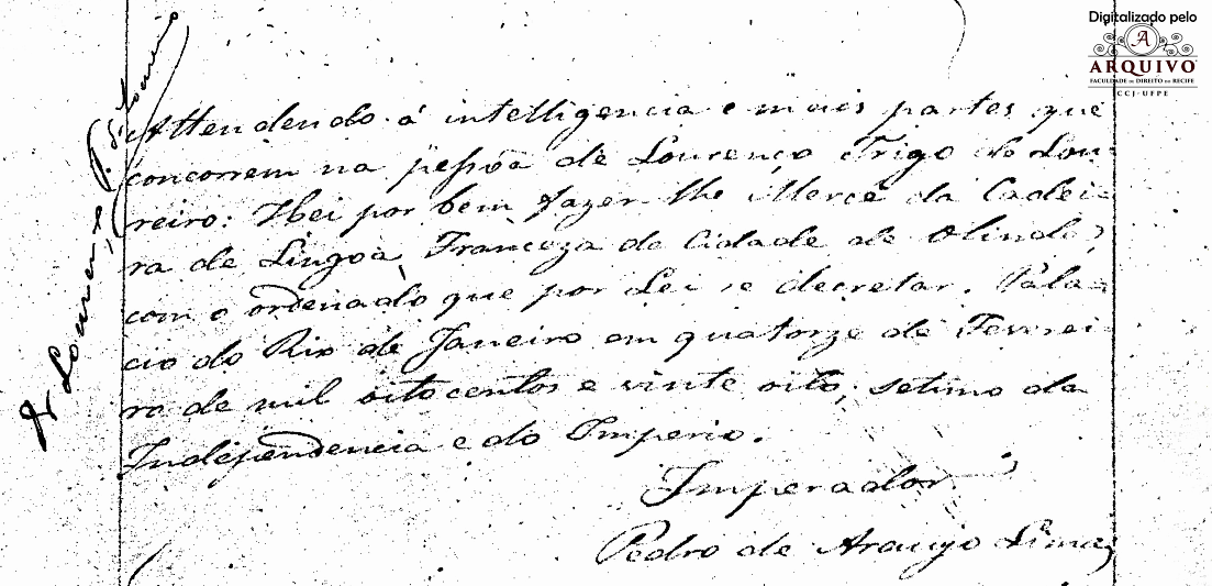 Conforme consta no livro de Posse, aos 27 de março de 1833, neste mosteiro de S. Bento, Perante o Diretor Interino D. Manoel Ignacio de Carvalho, compareceram os Bacharéis José Antônio Pereira, Francisco Joaquim de Chagas e Lourenço Trigo de Loureiro perante a Congregação de Lentes e foi lido o Aviso de 05 de fevereiro de 1833 e decreto da 1 de fevereiro de 1833, em virtude do qual houver a Regência por bem nomeá-los o substituto interino do Curso Jurídico.