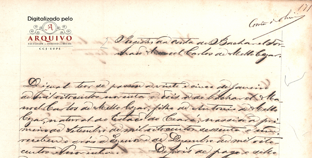 >> Certidão de idade de 1886 – Aluno Manoel Carlos de Mello Cezar – Acervo do Arquivo da FDR