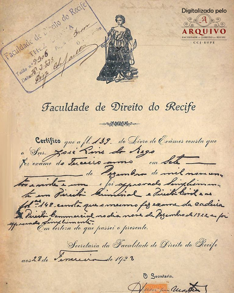 Na imagem, julgamento dos exames do 3° ano de José Lins do Rego, em 07 de dezembro de 1921. Arquivo da Faculdade de Direito do Recife.