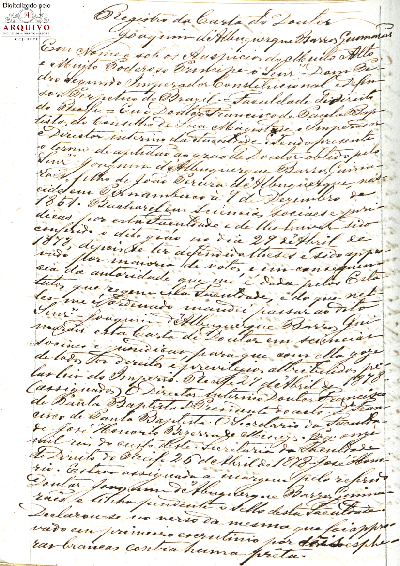 >> Livro de Registro de diplomas de Doutores 1833 - 1883 - pág. 46 – Acervo do Arquivo da FDR