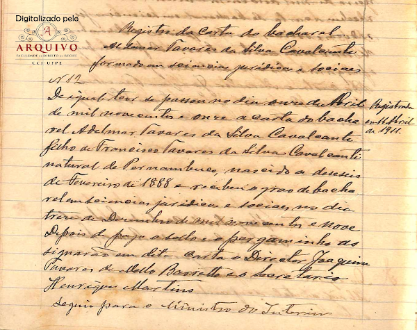 Recebeu o grau de Bacharel em Ciências Jurídicas e Sociais, em 13 de dezembro de 1909 - como segue a imagem abaixo: