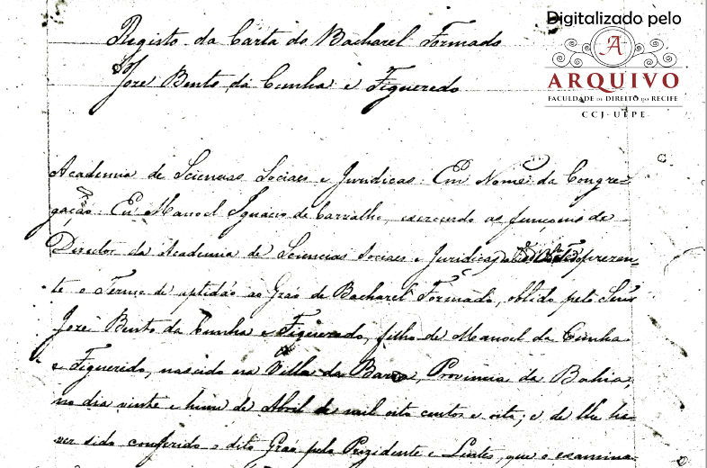 Aos 12 de fevereiro de 1836, nesta cidade de Olinda, secretaria da Academia Jurídica da mesma, perante o Diretor interino Miguel do Sacramento Lopes Gama, compareceu o Dr. José Bento da Cunha Figueredo, substituto as cadeiras da Academia e apresentado a provisão pela qual o governo da província houve por bem prover ao sobredito Dr. Figueredo provisoriamente no emprego de Lente Proprietário da 2ª cadeira do 2º ano do curso das ciências Jurídica e sociais da cidade de Olinda. E em 29 de agosto de 1836, nesta cidade de Olinda e secretaria da Academia Jurídica perante a Diretor interino Miguel do Sacramento Lopes Gama, compareceu o Dr. José Bento da Cunha Figueredo apresentando a carta imperial que nomeá Lente Proprietário da 2ª cadeira do 2º ano.