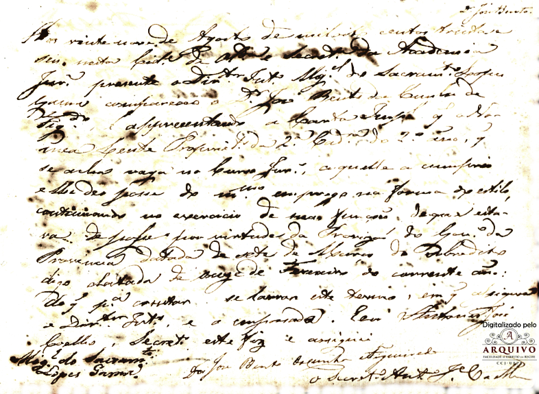 Aos 22 de janeiro de 1835 nesta cidade de Olinda e Mosteiro de São Bento na secretaria do curso jurídico compareceu Dr. José Bento da Cunha Figueredo e apresentou a sua provisão de lente substituto do curso jurídico desta cidade passada pelo Exmo. Presidente desta província para tomar posse e Diretor interino Padre Miguel do Sacramento Lopes Gama a cumpriu. E em 27 de abril de 1835, neste Mosteiro de São Bento na secretaria do curso jurídico, perante o Diretor interino Dr. Antônio José Coelho, compareceu Dr. José Bento da Cunha Figueredo e apresentando a carta imperial que o nomeá de Lente substituto as cadeiras deste curso jurídico.