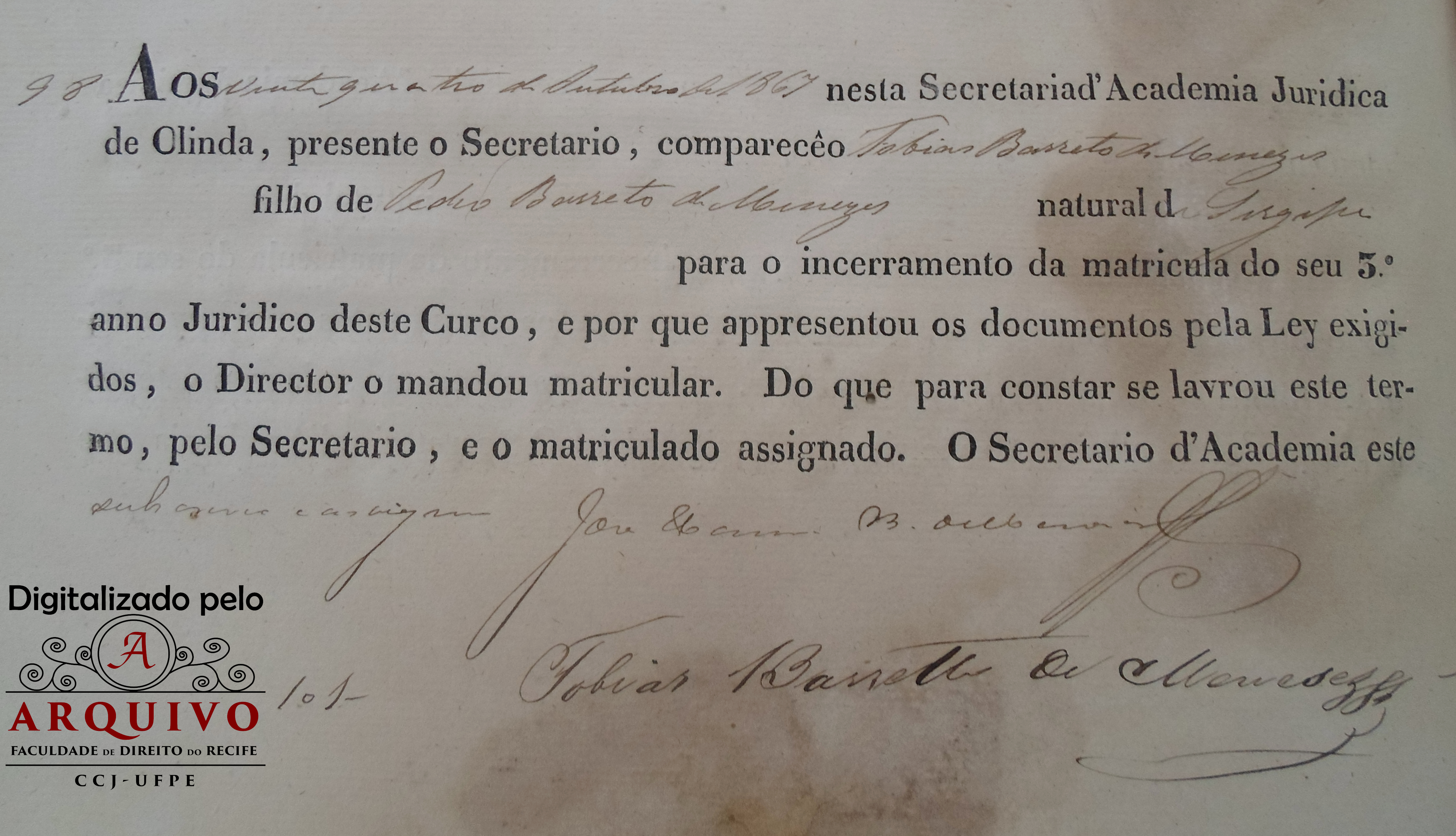 Tobias Barreto de Menezes, filho de Pedro Barreto de Menezes, nasceu em 07 de junho de 1839, Sergipe, e faleceu no Recife, em 27 de junho de 1889. Bacharelou-se ciências jurídicas em 15 de novembro de 1869 e doutorou-se em 1882. Foi lente substituto a partir de 14 de agosto de 1882 e professor catedrático a partir de 07 de novembro de 1887.