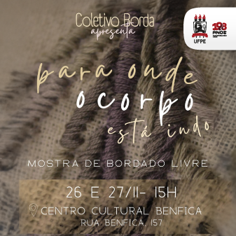 "Para onde o corpo está indo?”. Essa foi uma das perguntas feitas por um grupo de mulheres a partir das reflexões surgidas com a leitura do poema “Um dia eu vou amar Ocean Vuong”, do poeta vietnamita-americano Ocean Vuong. As dezesseis mulheres, que formam o Coletivo Borda, não só refletiram como transformaram o que sentiam sobre o tempo e as marcas dele em suas vidas em arte bordada. O resultado desse trabalho pode ser visto nesta quarta (26) e quinta-feira (27), das 15h às 18h, no Atelier 2 do Centro Cultural Benfica. O espaço fica localizado na Rua Benfica, n.º 157, no bairro da Madalena. A entrada é gratuita.