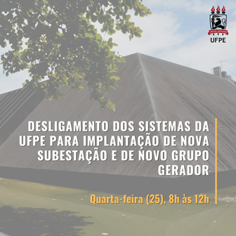 Todos os sistemas da Universidade Federal de Pernambuco (UFPE) serão desligados na próxima quarta-feira (25), das 8h às 12h, para a implantação da nova subestação e do novo grupo gerador da Superintendência de Tecnologia da Informação (STI). O desligamento do Centro de Dados, que abriga todos os sistemas, vai impedir o acesso ao Siga, Sipac, Central de Serviços e portal da UFPE, entre outros, apenas durante esse turno.