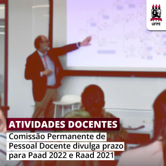 A Comissão Permanente de Pessoal Docente (CPPD) da UFPE divulga o prazo para o preenchimento e homologação do Plano Anual de Atividades Docentes (Paad) 2022 e do Relatório Anual de Atividades Docentes (Raad) 2021. Ambos terão início no dia 27 de fevereiro e fim entre outubro e dezembro deste ano.
