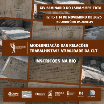 Estão abertas as inscrições para o XIV Seminário do Laboratório História e Memória (LAHM) da UFPE, que este ano tem como tema “Modernização das leis trabalhistas? Atualidade da CLT”. O evento ocorre de quarta a sexta-feira (dias 12 a 14), em formato híbrido. A programação contará com oficinas, minicursos, conferências e mesas-redondas, com transmissão ao vivo das sessões abertas. O seminário é gratuito e oferece certificação para participantes inscritos. Os interessados podem se inscrever por meio do link.