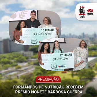 Dois formandos do curso de Nutrição da Universidade Federal de Pernambuco (UFPE) conquistaram o 1º e o 2º lugar do Prêmio Nonete Barbosa Guerra com seus trabalhos de conclusão de curso (TCC): João Carlos Fonseca da Silva e Mirella Vitória Morais Silva. A premiação, entregue no último dia 4, é oferecida pela Associação Pernambucana de Nutrição (APN).