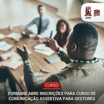 A UFPE, por meio da Escola de Formação dos Servidores (Formare), divulga a abertura de inscrições para o curso “Comunicação assertiva para gestores”, destinada a servidores que ocupam cargo de gestão. O curso, com carga horária de 20h, vai ser realizado na modalidade híbrida, com dois encontros síncronos nos dias 4 e 7 de novembro, das 14h às 17h30. As inscrições vão até as 12h do dia 28 de outubro, por meio do link.