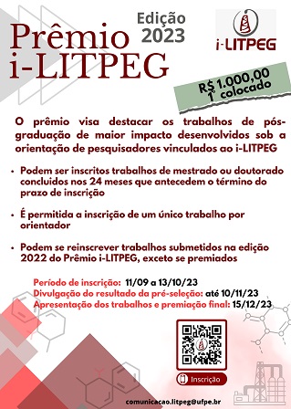 O Instituto de Pesquisa em Petróleo e Energia (I-Litpeg) da UFPE convida estudantes de pós-graduação a participarem do Prêmio I-Litpeg – Edição 2023 de produção científica. Este prêmio tem como objetivo reconhecer os trabalhos de pós-graduação que mais se destacaram e foram desenvolvidos sob a orientação de pesquisadores afiliados ao I-Litpeg. As inscrições estão abertas e vão até o dia 13 de outubro. O prêmio contemplará o primeiro colocado com um prêmio em dinheiro no valor de R$ 1 mil.
