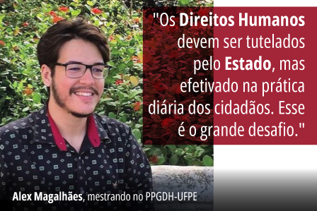 Adotando como ênfase os estudos justransicionais e lógica colonial, o mestrando no PPGDH-UFPE Alex Magalhães é especialista em Filosofia e Teoria do Direito, além de colaborador nos Grupos de Pesquisa Pós-Colonialidade e Integração Latino-Americana (FRD-UFPE/CNPq) e Contemporaneidade, Subjetividades e Novas Epistemologias (UPE/CNPq). Natural de Caruaru, Alex é egresso da escola pública estadual e se interessou pela temática dos DDHH ainda na graduação. “Participei de atividades de Pesquisa e Extensão Universitária no grande campo dos Direitos Humanos, movimentos sociais, memória, identidade e cultura, além de me envolver com temáticas relativas ao meio ambiente, sociedade e diversidade”, relembra.