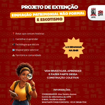 Estão abertas as inscrições para o projeto de extensão “Educação patrimonial, turismo e escotismo”, iniciativa que envolve discentes de graduação e pós-graduação da Universidade Federal de Pernambuco (UFPE) com foco na valorização de memórias e patrimônios afro-brasileiros e indígenas em contextos urbanos e rurais. Coordenado pelo professor Alex Sandro Gomes, do Centro de Informática (CIn), o projeto prevê o desenvolvimento de rotas geolocalizadas com conteúdos multimídia, além da realização de atividades educativas em parceria com grupos escoteiros.