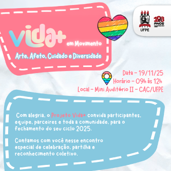 O Projeto Vida+, iniciativa de extensão da Universidade Federal de Pernambuco (UFPE) voltada à atenção psicossocial de pessoas LGBT+, encerra a agenda de atividades deste ano com o evento “Vida+ em movimento: arte, afeto, cuidado e diversidade”. O evento ocorre nesta quarta-feira (19), das 9h às 12h, no Mini Auditório II do Centro de Artes e Comunicação (CAC). A ação marca a finalização de um ano de atividades, reunindo participantes, equipe e parceiros em um encontro dedicado à integração, à produção artística e à reflexão sobre diversidade e saúde mental.