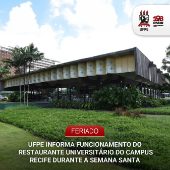 A Universidade Federal de Pernambuco (UFPE), por meio da Pró-Reitoria para Assuntos Estudantis (Proaes), informa que o Restaurante Universitário (RU) do Campus Recife funcionará normalmente até o jantar desta quarta-feira (1º). O RU ficará fechado a partir de quinta-feira (2), durante o período da Semana Santa, retomando as atividades no desjejum da segunda-feira (6).