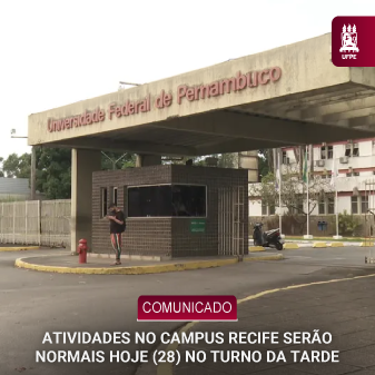 A administração central da UFPE informa que as atividades acadêmicas e administrativas serão normais hoje (terça-feira, dia 28), no turno da tarde, no Campus Recife, à exceção das localizadas no prédio da Reitoria, onde foram registrados alguns danos devido ao volume de chuvas.